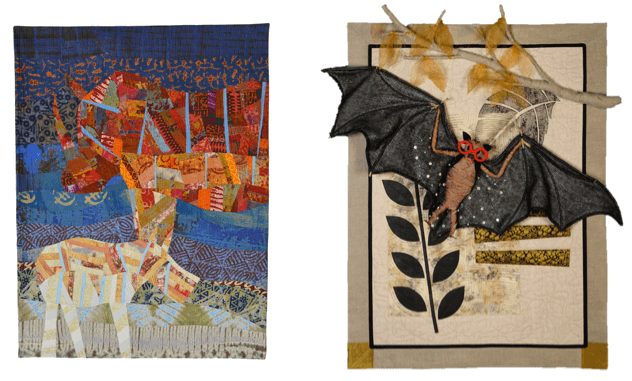 Holly Altman’s Blind As a Bat (below, at right) uses “dimensional quilting.” Sewn, fabric objects literally come off the quilt resembling low-relief sculpture.