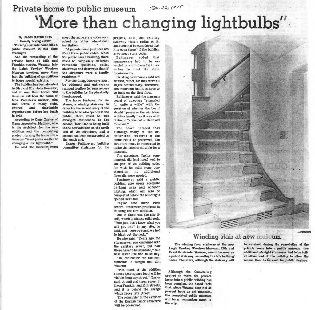 The vision for the Woodson Art Museum began with plans by Leigh Yawkey Woodson’s three daughters, Nancy Woodson Spire (1917-1998), Alice Woodson Forester (1918-1994), and Margaret Woodson Fisher (1920-1972) to create a museum in memory of their mother. Alice Woodson Forester and her husband John E. Forester soon donated their Cotswold-style home to serve as the fledgling Museum’s original structure, and renovations and an addition transformed the house to include administrative offices, three large galleries, and public amenities.