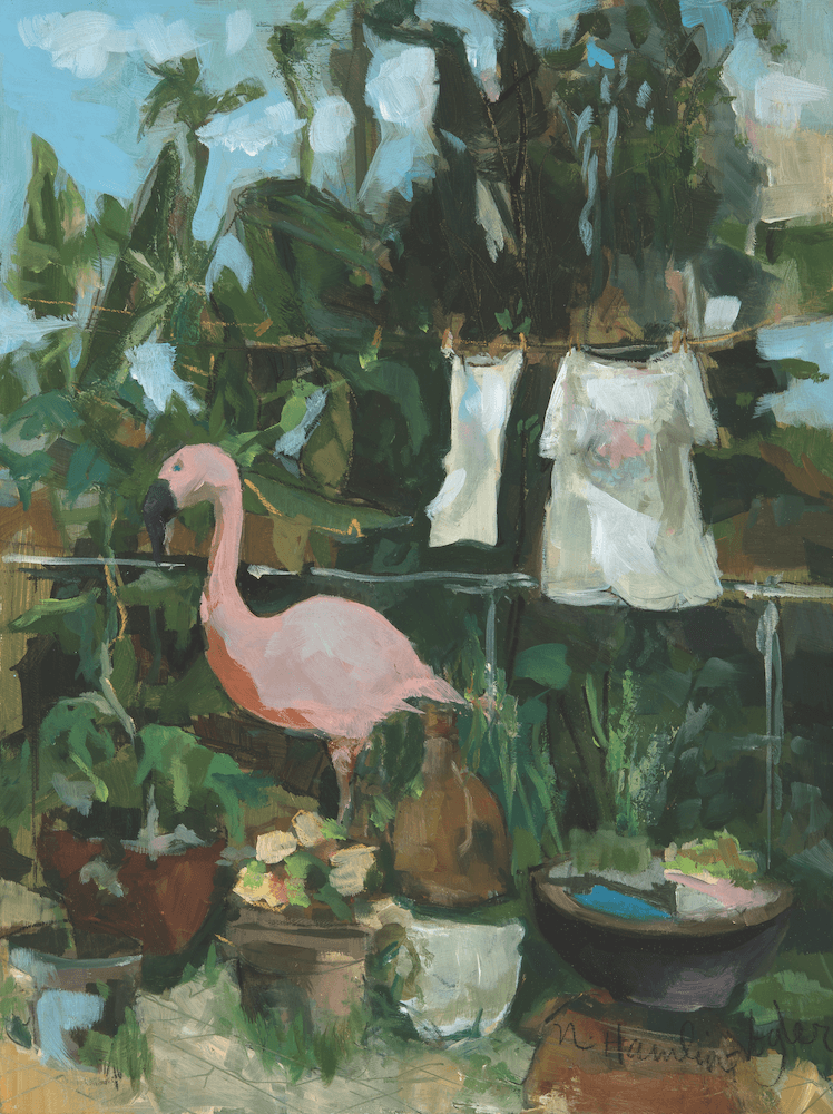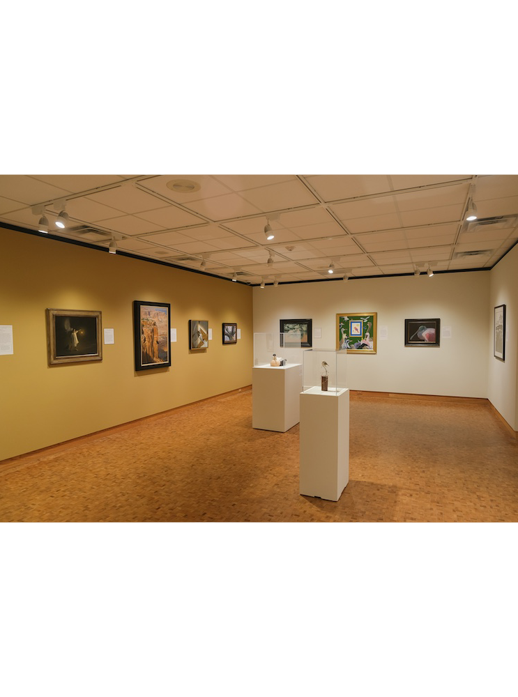 (Top) Chris Lodge, Arctic Realm, 2025, oil on board; (Background) Karen Bondarchuk, Tree of Knowledge, 2025, charcoal on Rives BFK paper; (Above) Gigi Chen, Vacancy, 2023, acrylic on wood panel; Mark Eberhard, Winter, 2025, linocut on Japanese mulberry paper; Mary Kay West, Art Appreciation, 2025, oil on panel; Scott Yablonski, Fiesta, 2025, acrylic on gessoboard; Gary Eigenberger, Walk on Water, 2025, oil and acrylic on tupelo and brass; Nancy Hamlin-Vogler, Flamingo Yard Art and Still Life, 2025, oil on wood cradle board; Diana Höhlig, Nocturnal Affinity, 2025, scratchboard on Ampersand scratchbord; Yoshikazu Natsume, A Sparrow Watching an Elephant, 2024, acrylic and gouache; Robert Voigts, tH_elast (cedarbird, 2025, found paper collage; Anthony Drehfal, Heronry, 2024, wood engraving on paper; Darren Rees, Blue Kites, 2024, acrylic on MDF panel; Chris Rose, Eiders on Foreshore, 2024, oil on Italian fine linen; Jennifer Felton, Trepidation, 2025, tupelo and brass; (Below) Jim Rataczak, Hanging in the Balance, 2025, oil on linen on board; Mark A. Collins, Of Primary Importance, 2025, oil on linen on Artefex aluminum panel