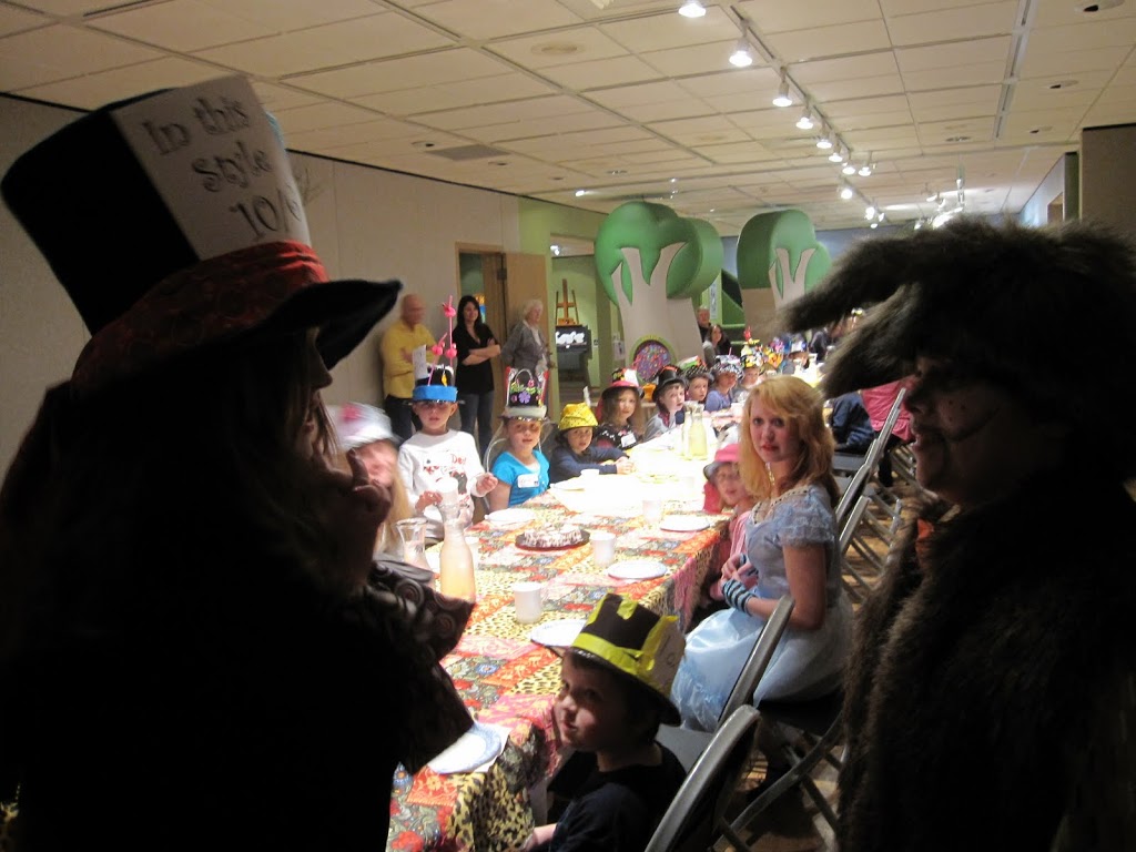 The Hatter and March Hare tried to sing “Twinkle, Twinkle Little Star” but sang of a bat and tea tray instead. It was a most confusing tea party for Alice. She didn’t quite know what to say, so she helped herself to some tea and cake. The young guests, though appropriately puzzled, giggled graciously and maintained their good manners most admirably.