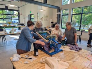 On Monday, September 29, the Glass Box Studio was filled with our greeters and docents. Through the printing tutorials and messy ink encounters, the studio was bubbling with joy. It always makes my heart happy to see everyone together, bonding and creating community over something as simple as a printed t-shirt. While the adventure was brief, the studio was once again filled with shirts to be heat set before they were sent home. The volunteer gardeners graced the studio on Friday, October 3, for a special end of the week treat. For this small group of folks who keep our gardens looking marvelous, matching shirts were in order.