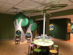 Each exhibition period, fellow educator Rachel Hausmann-Schall and I determine how Art Park can help visitors engage in hands-on experiences themed around the current exhibitions. This space has seen it all. From hats hanging high above visitors’ heads to storybook characters flying across the walls, heck even a larger-than-life cardboard moose and a giant cake have graced the lower-level’s interactive space.
