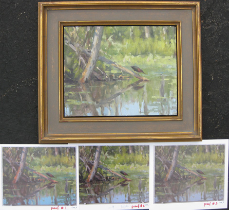 The process begins with a digital image provided by the artist. That electronic file is sent to Reindl Printing. The file is opened and printed. Each reproduction is carefully scrutinized for color accuracy. Ideally, my efforts to achieve color perfection are aided by an artist-supplied, certified color proof. Absent that, a closely matched color reproduction or even better, the original artwork, is used.